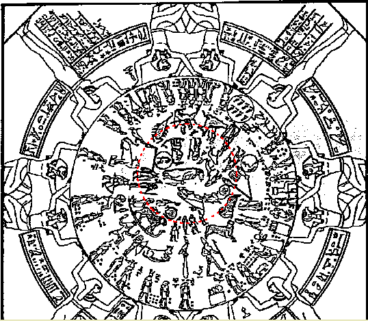 From the New Book of Knowledge page 470 - under astronomy here is a drawing copied from the Stone of Denderah, an ancient Egyptian sky map. It shows many familiar constellations, including those making up the Zodiac located along a (red) dotted-line circle.