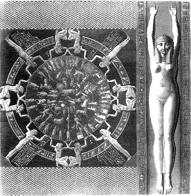 The picture above is the ceiling view of the zodiac of Denderah (Egypt) which can be found at "http://www.iuav.unive.it/dpa/ricerche/trevisan/den_5a.htm" a site by Camillo Trevisan whose Figure 5a is from the book by Denon Description de l'Egypte, vol. IV, pl. 21, Dendera, the grand temple.