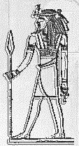 He is the Egyptian version of the Semetic Aleyin/Amurru. On a limestone stele from Egypt, 1350-1200 B.C., of the nude Syrian goddess Qadesh, goddess of love, an aspect of Hathor, is seen standing on a lion flanked by Min and Resheph. On the lower part, three figures present offerings to the Phoenican earth goddess Anat (Qadesh), who was introduced into Egypt by the Hyskos (1650 B.C.) at a shrine at Avaris.