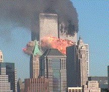 - 8:48 a.m: The first attack a large plane, possibly a hijacked airliner, crashes into the north tower of the World Trade Center towers, tearing a gaping hole in the building and setting it afire in Manhattan.
