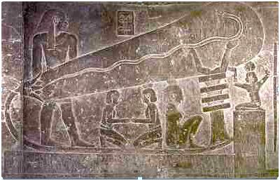 The "light bulb" of Dendera has on the foot something like a socket, into which a "cable" runs, which is connected on the other side with a "generator." But the cable is no cable, as in the texts describing the scene, a symbolic sun barge, a boat in which the sun floated across the sky.