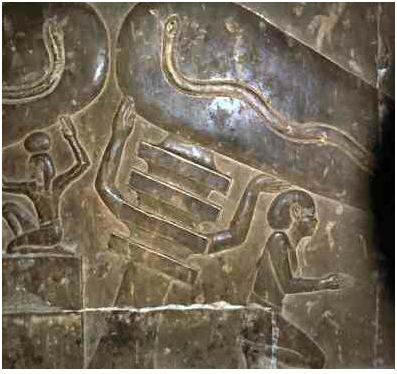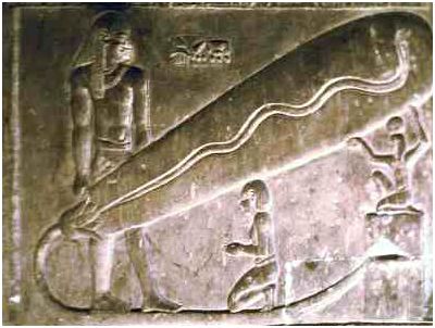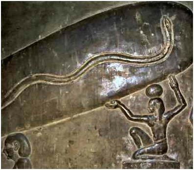 Usually the underworld serpent was everyone's worst nightmare, threatening world order by scheming to prevent the sun from rising, the Egyptians regarded the glorious solar serpent as the symbol of elemental fire, and portrayed draped over the sun disk, or rearing up as the fire-spitting Uraeus serpent that graced the king's forehead as his living diadem. But as the radiant core of its own fire element the solar serpent resided vertically within the solar disk as the resplendent center of the center, it's essence-the Ka of the Sun.