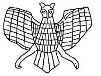 from a Sumerian mace-head where he comments "The Anzu-bird was envisioned as a giantic lion-headed eagle, whose enormous wings were thought to create the winds, stir up storms and cover lands in rolling fog. As a seasonal symbol the Anzu Bird represents the storms of winter; he is the Mesopotamian thunderbird whose spirit pervades the winds.